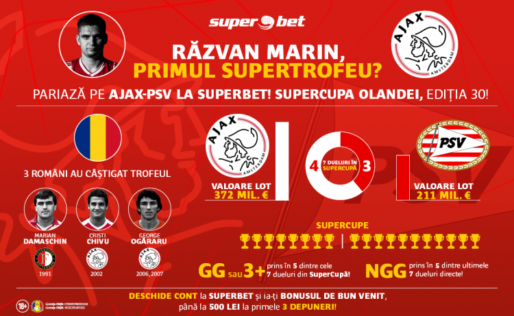 În condițiile în care pariul special Superbet, GGsau3+, a ieșit câștigător în 5 dintre ultimele 7 meciuri și în ultimele patru partide, specialiștii așteaptă un nou meci-spectacol. Unul în care Răzvan Marin, debutant la Ajax pe 15 iulie într-un amical cu vicecampioana Turciei Istanbul Bașakșehir, e așteptat să strălucească de către antrenorul Erik Ten Hag: “Răzvan Marin a arătat imediat de ce l-am adus. Bineînţeles, mai are nevoie de îmbunătăţiri pentru că stilul lui Ajax solicită un anumit timp de adaptare pentru fiecare jucător. Calităţile sale sunt vizibile şi arată că poate face asta. Am aşteptări mari de la el”, a declarat antrenorul lui Ajax, după primul meci al lui Răzvan Marin alături de noii colegi.