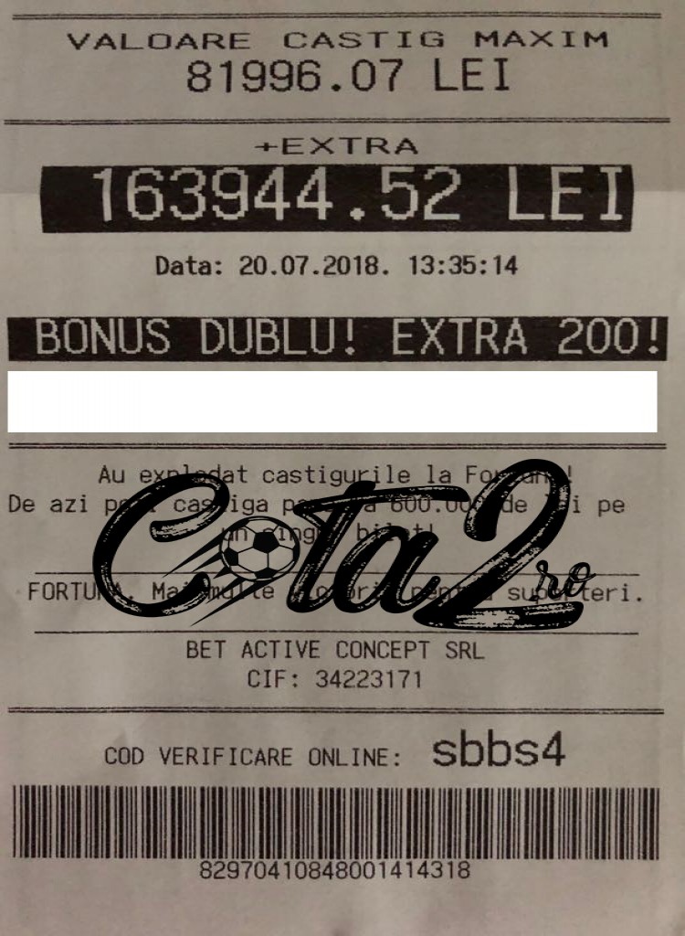 Aveți în imagine codul de verificare online pe site-ul Fortuna pentru acest bilet, iar mai jos aveți detaliate și meciurile selectate cu pronosticurile aferente!