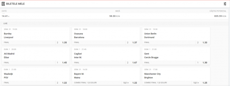 Cel de-al doilea bilet are o cotă de 14+ și este format din 9 soliști! Pentru a mări un pic cota, la două dintre ele am combinat și cu minim un gol marcat în prima repriză. Am jucat biletul la SUPERBET, iar meciurile le puteți vedea mai jos