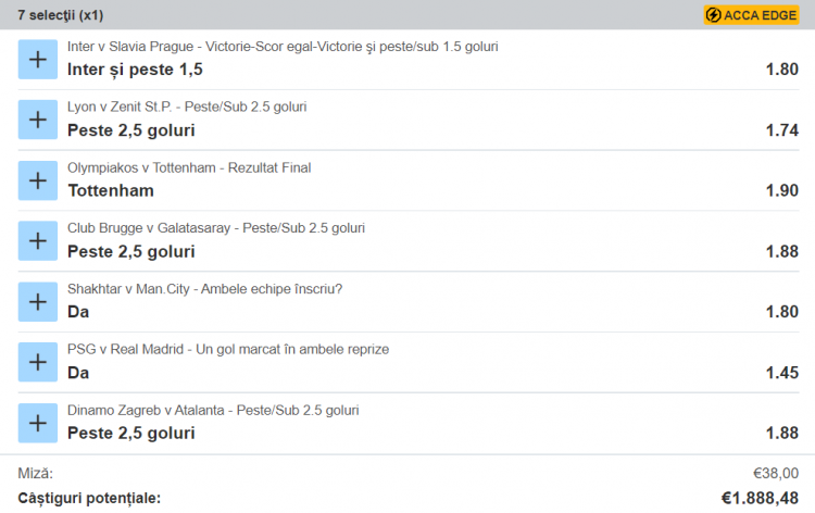 Prieteni, haideți să ne încercăm norocul în prima etapă de Champions League așa cum se cuvine, cu un bilet îndrăzneț! Eu am analizat meciurile de marți și miercuri și am selectat pe biletul meu 7 din cele 16.