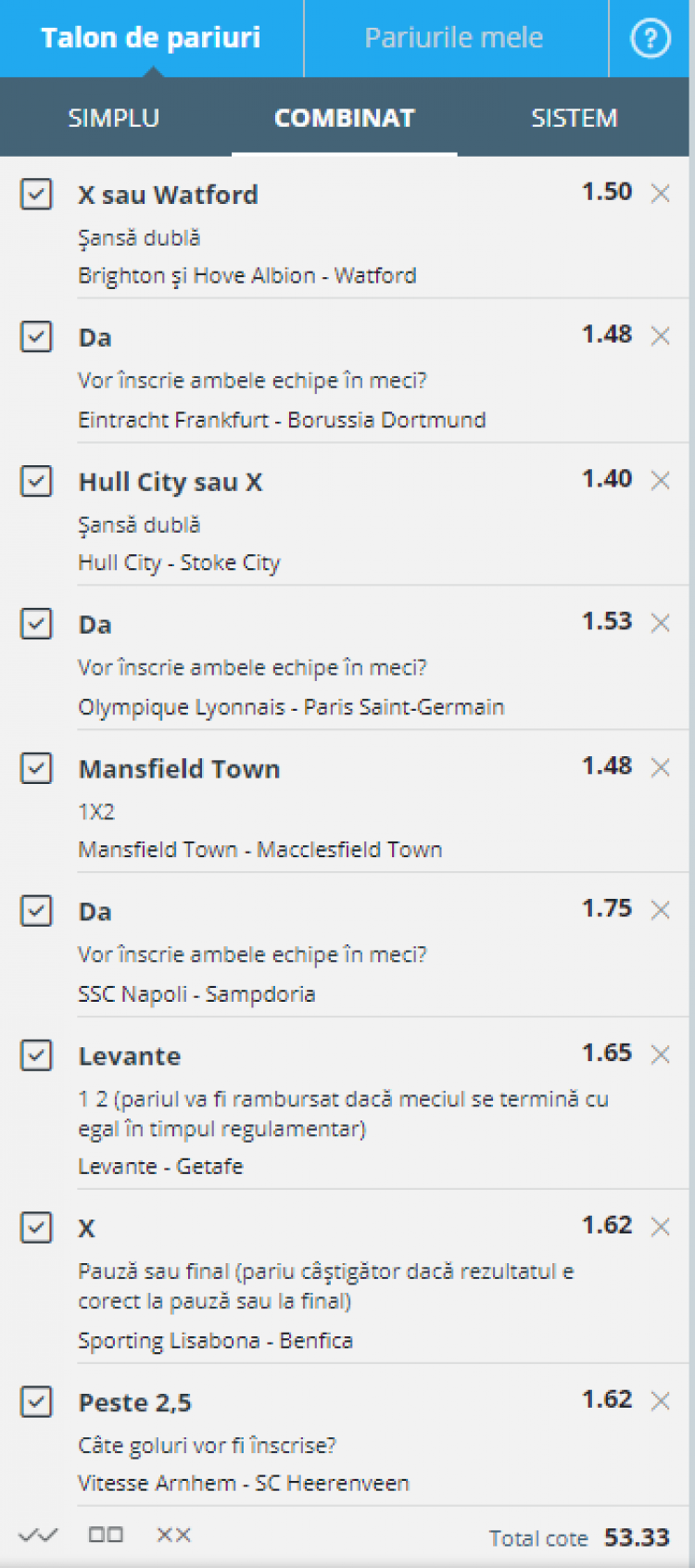 Prieteni, pentru acest weekend eu voi încerca să dau o primă lovitură cu un bilet curajos, format din 9 meciuri. Cota finală este puțin peste pragul de 53, ceea ce presupune mize mici, deoarece factorul de risc este mare. Fiecare selecție în parte are șanse de reușită individuale de peste 55%, dar conform cotei finale, un astfel de bilet are sub 2% șanse de câștig, să sperăm că acesta face parte din acele 2 procente norocoase :)
