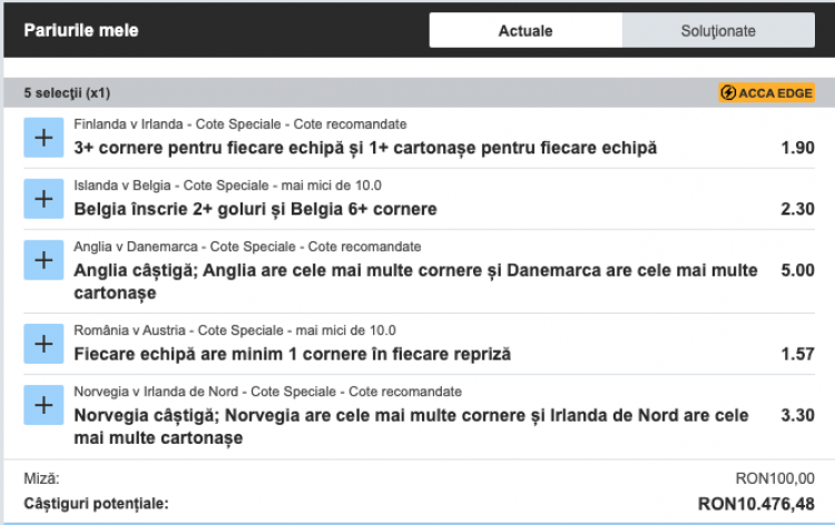 Meciurile au fost selectate din oferta de pariuri speciale pe care le propune BETFAIR SPORTSBOOK, pentru meciurile tari în fiecare zi, plus că aveți posibilitatea să optați pentru asigurarea ACCA EDGE, care vă returnează miza în cazul în care se pierde un singur meci de pe bilet, așa cum am făcut și eu! În acest caz, cota finală a biletului scade de la 114 la 104, dar în cazul în care pierd la un singur eveniment, am miza înapoi.