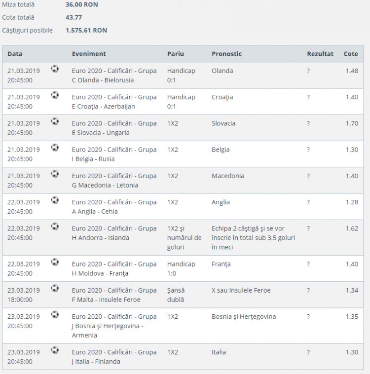 Prieteni, avem parte în zilele ce urmează de meciuri din prima etapă a campaniei de calificare pentru EURO 2020 și am încropit deja un bilet din 11 meciuri care ne poate returna un câștig de 43 de ori mai mare decât miza.
