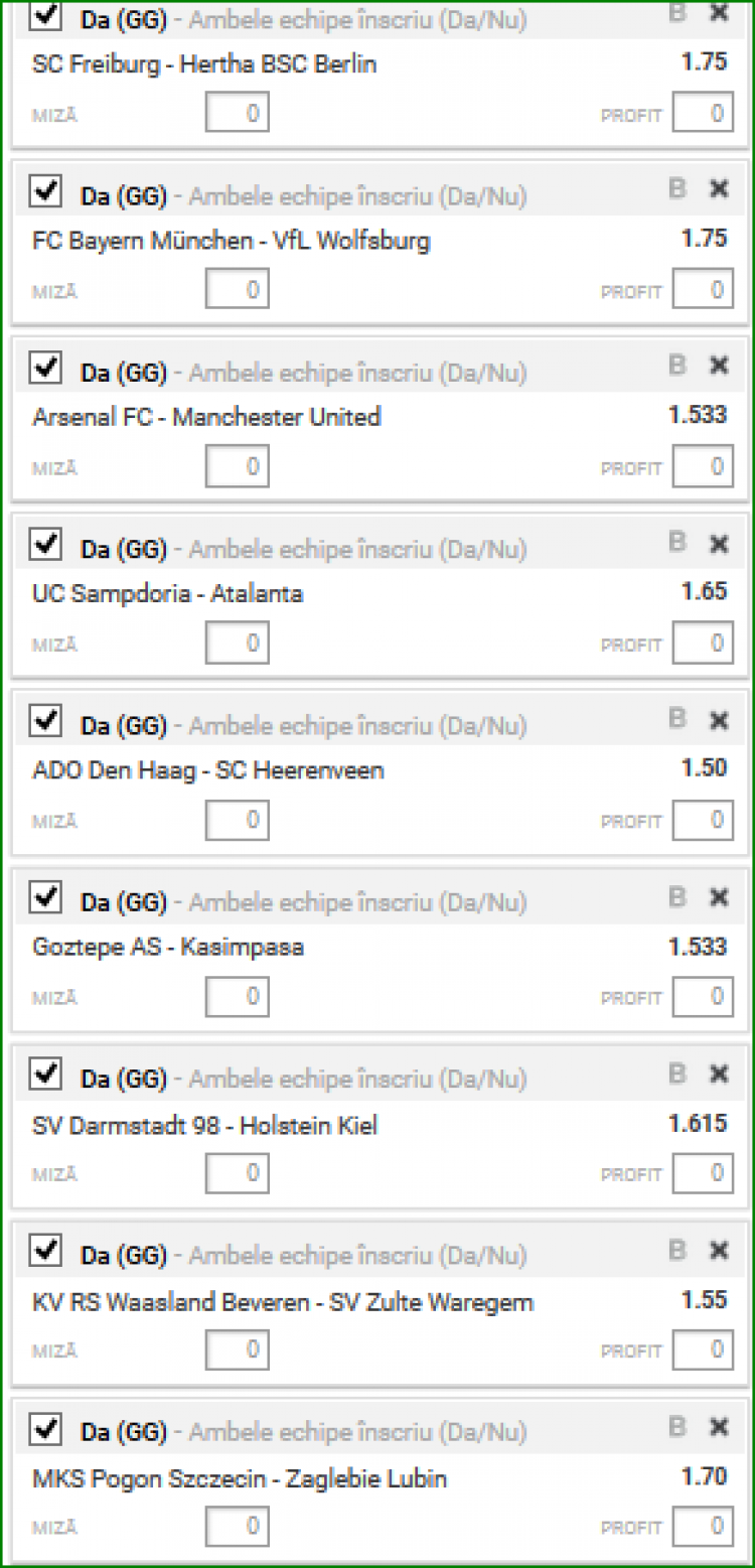 Un bilet in cota 75 cu noua pronosticuri GG . Eu il plasez in acest format dar va invit sa modificati ,eliminati pronosticurile care nu va inspira incredere