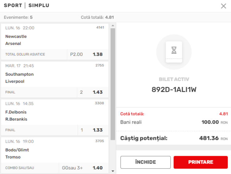Cotele acestui bilet sunt luate din oferta SUPERBET!