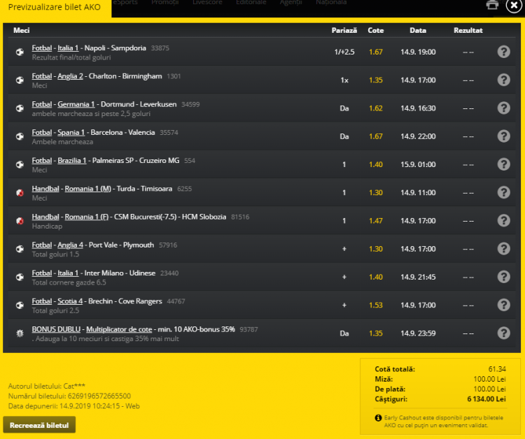 Am jucat acest bilet la Fortuna Online, deoarece, după cum puteți vedea, primim cu 35% mai mult câștig la cota finală dacă am adăugat 10 meciuri.