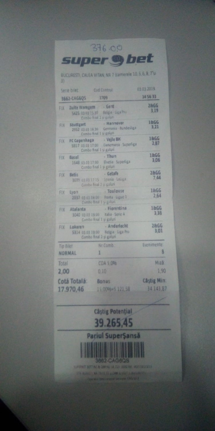 Un parior a fost aproape să dea o frumoasă lovitură dumincă, 3 martie, într-una dintre agențiile Superbet de pe Calea Vitan. A jucat 8 meciuri identice, adică pronostic pe victoria uneia dintre echipe însoțit de ambele marchează. Au rezultat numai cote bune, toate în jur de 3, iar cu minimul admis de 2 lei pariați s-a făcut un câștig eventual de aproape 40.000 de lei.
