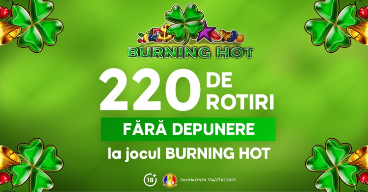Toți jucătorii care își deschid un cont nou la Maxbet Online folosind butonul de mai jos, vor fi răsplătiți cu 220 de rotiri cadou din partea casei, FĂRĂ DEPUNERE, disponibile la jocul Burning Hot, unul dintre cele mai îndrăgite păcănele cu fructe și șeptari!