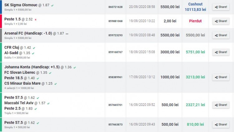 În luna Septembrie, sutele de pariori care au jucat pariurile din cadrul proiectului, au fost foarte mulțumiți, iar rezultatele se pot vedea în imaginile de mai jos, cu titlu de exemplu. Practic, s-a reușit de două ori ca de la 500 de lei să se ajungă la 10.000 în decurs de doar câteva zile prin câteva secvențe de pariuri câștigătoare.