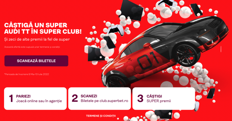 Super-campania primăverii vine de la Superbet, o promoție cu 31 de premii, în valoare totală de 285.716,70 lei! Marele cadou pus la bătaie în “SuperPasiuni turate la maxim!” este, nici mai mult, nici mai puțin, decât un Super-Audi TT. Câștigătorul va fi desemnat pe 15 iulie 2022.