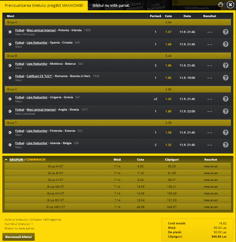 Dacă iese și grupul C, avem câștigul maxim posibil de 840.86 de lei