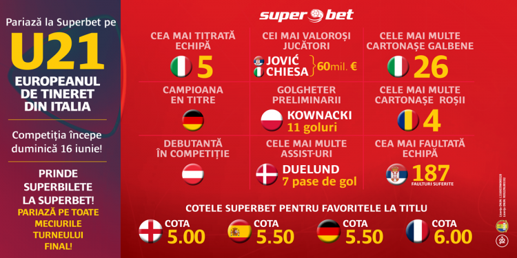 România joacă pentru prima oară din 1998 încoace la un European Under 21 și pentru a doua oară în istorie. Avem garanția unui superturneu de la care nu lipsesc forțe precum Italia, Spania, Germania, Anglia și Franța. O competiție pentru care Superbet a pregătit ofertă la cote mărite pentru fiecare meci. Partidele se vor regăsi în oferta Super Cota sau Super Extra, iar cele mai tari meciuri vor beneficia și de oferta Super Live. De asemenea, sunt disponibile și Speciale.