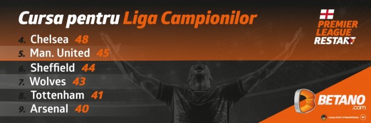 Cu Manchester City eliminată timp de două sezoane din Liga Campionilor din cauza fair-play-ului financiar, speranțele echipelor pentru un loc în cea mai prestigioasă competiție pe plan european cresc. Leicester pare să-și fi acontat deja ultima treaptă a podiumului și calificarea în Champions League, așa că echipele mari se bat pentru cele două locuri rămase. Chelsea și Manchester United le ocupă acum și pornesc cu cele mai mari șanse, însă clasamentul e extrem de strâns. Chiar și nou-promovata Sheffield United, aflată în acest moment pe locul 6, cu 44 de puncte strânse în 29 de etape, are șansa ei la un loc în “Big Four”. Elevii pregătiți de Chris Wilder se află la doar patru puncte în spatele locului 4 ocupat de Chelsea, iar în acest weekend se deplasează pe terenul celor de la Newcastle.