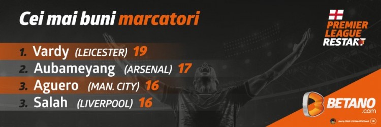 Vardy este lider cu 19 goluri marcate, urmat de Aubameyang cu 17, iar goleadorii ocupantelor primelor două locuri din clasament, Agüero și Salah, împart poziția a treia a podiumului. Un Agüero ieșit din formă cu doar două goluri în ultimele șapte partide de Premier League, un Aubameyang amețit de poziția sa în teren și un Salah deja campion, mai poate fi oprit goleadorul celor de la Leicester, Jamie Vardy? Cota Betano ca vârful lui Leicester să păstreze prima poziție e de 2.75!
