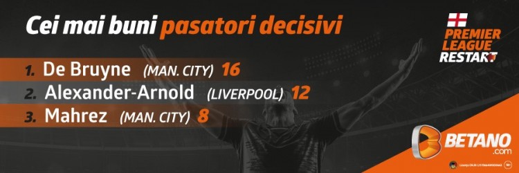 Cursa pentru cel mai bun pasator decisiv din Premier League este una dominată cap-coadă de către magicianul trupei pregătite de Pep Guardiola, Kevin de Bruyne. Belgianul a ajuns la 16 pase de gol în acest sezon de Premier League și pare că nimeni nu îl poate ajunge din urmă. Cel puțin așa am putea crede în primă fază, dar după aceea vedem cine este ocupantul locului secund, fundașul dreapta al cormoranilor, Trent Alexander-Arnold. Ultima treaptă a podiumul este ocupată de coechipierul liderului, Riyad Mahrez, care a oferit 8 assisturi colegilor săi.