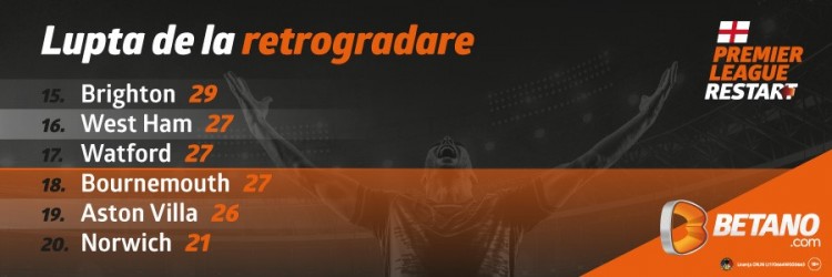 Șase echipe. Trei retrogradează, trei se salvează. Bătălia continuă, iar Norwich încă nu capitulează. Cu doar 21 de puncte adunate în 29 de etape și titlul de "lanternă roșie" acordat de mulți oameni de fotbal, elevii pregătiți de Daniel Farke nu renunță la luptă. Canarii se află în ring alături de Aston Villa, Bournemouth, Watford, West Ham și Brighton. Între ele, doar 8 puncte, 27 puse în joc până la final. Cine va pica, cine va rămâne?