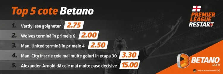 Miercuri a avut loc mini-restartul fotbalului în Anglia odată cu disputarea partidelor restante din etapa cu numărul 28: Aston Villa - Sheffield United, scor 0-0; Manchester City - Arsenal, scor 3-0. Vineri se dă restart total la fotbal în Premier League cu etapa 30, care îți aduce mii de opțiuni la pariuri sportive, pariuri speciale alături de cote mari pe Betano.