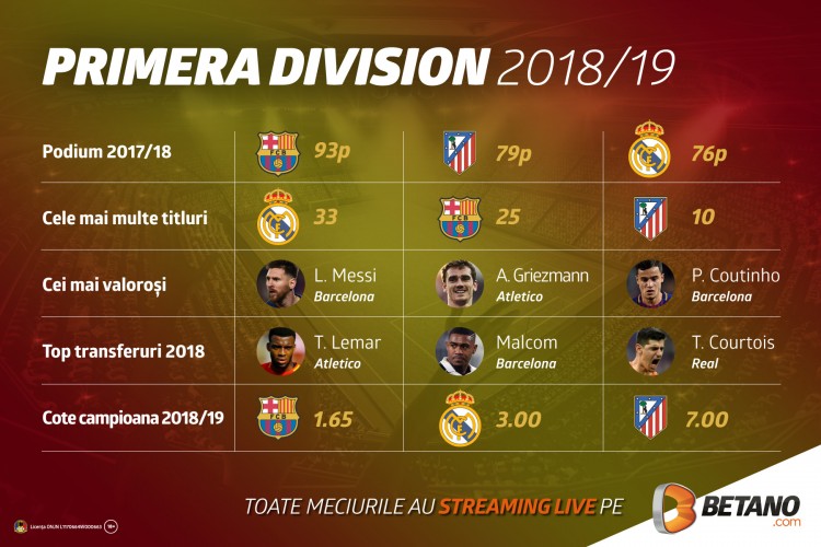În Spania a mers trofeul Ligii Campionilor în ultimii 5 ani, iar cel al Ligii Europa în 4 din ultimii 5. Hegemonia iberică a avut în prim-plan duelul dintre Cristiano Ronaldo și Lionel Messi, care acum poate deveni un duel între două campionate. Plecarea lui Ronaldo este o lovitură pentru Primera Division, cum poate fi considerată și cea a lui Zinedine Zidane. Chiar și fără ei, rămâne un campionat extrem de atractiv și spectaculos, plin de vedete. Messi, Suarez, Coutinho, Bale, Modric, Isco, Griezmann, Diego Costa și Godin vor fi, și în acest an, protagoniștii luptei pentru titlu.