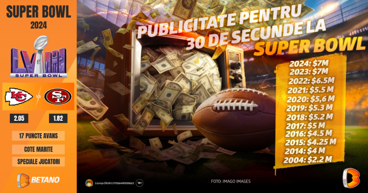 Așa cum se poate vedea din graficul atașat acestui material valoarea spotului de publicitate la Super Bowl a evoluat constant de la 2.2 milioane de dolari în 2004, la 4 milioane de dolari în 2014, pentru ca acum să ajungă la 7 milioane de dolari.