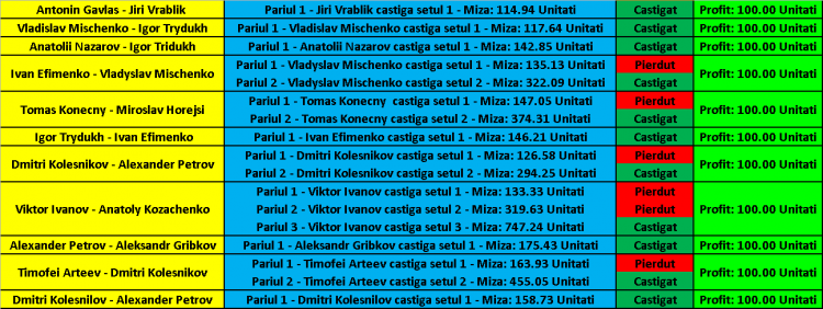 La aceste meciuri am ales sa mizez dupa Proiectul ”Stop at a Winner”, unul dintre cele mai bune proiecte de pe piata si cu care am reusit de-a lungul timpului rezultate foarte, foarte bune. Aceste meciuri de tenis le postez pe canalul de TELEGRAM: https://t.me/mihaigabrielcota2, iar la fiecare meci enumar: jucatorii meciului, ora disputarii partidei, turneul, sistemul de joc si ”h2h-ul” intalnirilor directe. Pana in acest moment am mizat pe 11 partide, profitul trecand de 1000 de unitati, in doar 3 zile, ceea ce e destul de bine. Rezultatele din ultimele 3 zile le aveti aici: