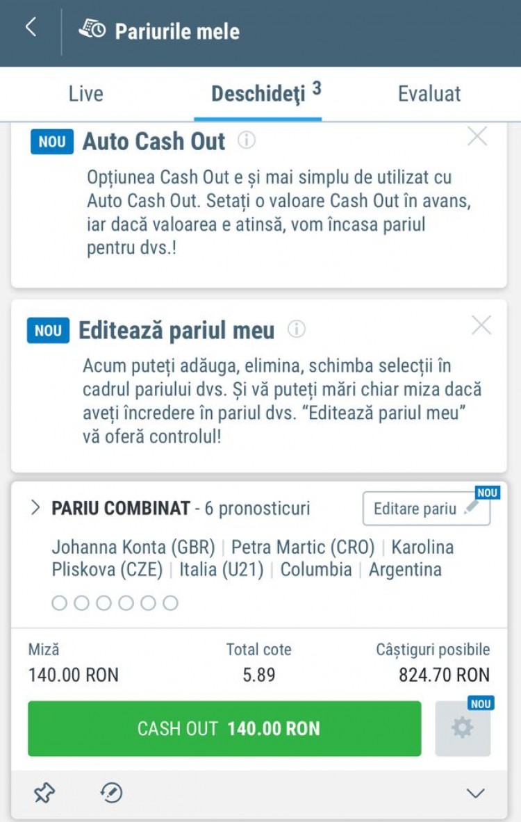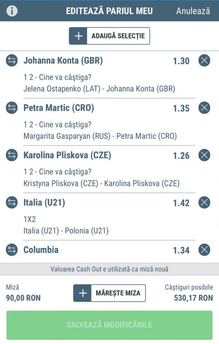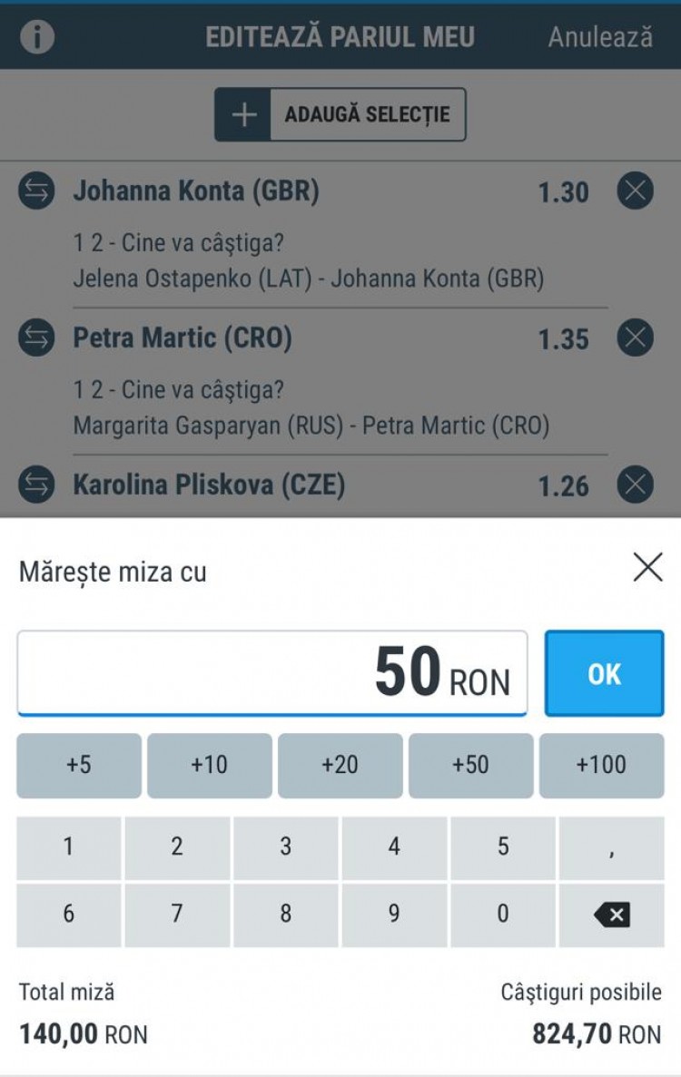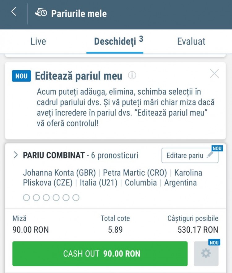 Mai jos poți vedea cât de simplă este procedura de editare a unui pariu. Am plasat un bilet format din 6 selecții, apoi mi-am dat seama că vreau să măresc miza, așa că am apăsat EDITARE PARIU și am mai adăugat 50 de Lei.