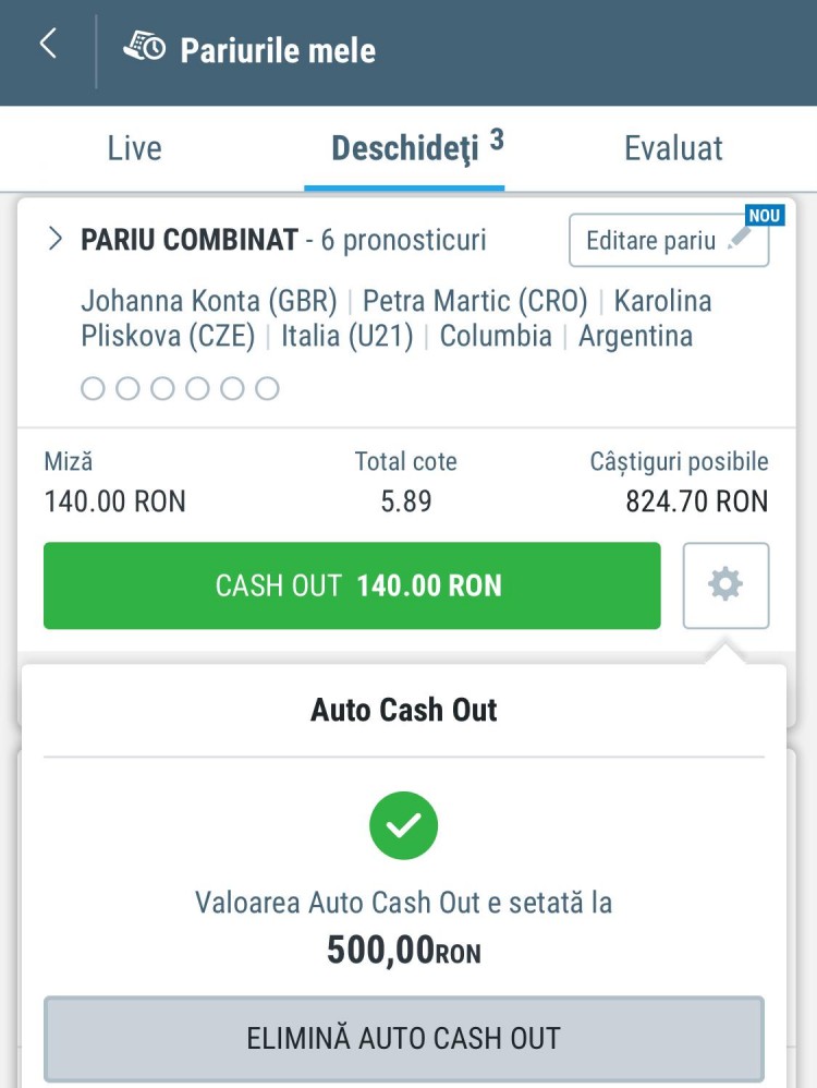 De asemenea, dacă vrei să stai liniștit și să nu ai emoții până la finalul biletului, la SportingBet poți seta o sumă la care casa de pariuri să îți facă AUTOMAT Cash-out. În exemplul de mai jos, poți vedea că am setat o valoare de 500 de Lei la care, dacă se ajunge, îmi convine să se efectueze CASH-OUT, ca să nu mai am niciun stres! Suma poate fi editată oricând cât timp biletul este activ! 👇