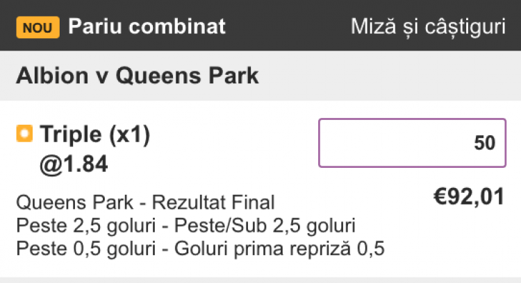 Meci mai dezechilibrat nu veți găsi curând în ofertele caselor de pariuri. O echipă cu fotbaliști trecuți prin prima ligă înfruntă una cu mulți amatori. Unde mai pui că sunt și cote mari, care merg speculate. Pe Betfair Sportsbook, pariul combinat victoria Queens Park, peste 2,5 goluri în meci și peste 0,5 goluri în prima repriză are o cotă de 1,84.