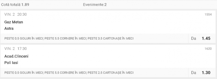 Biletul Zilei format din 2 meciuri la cota 1.89