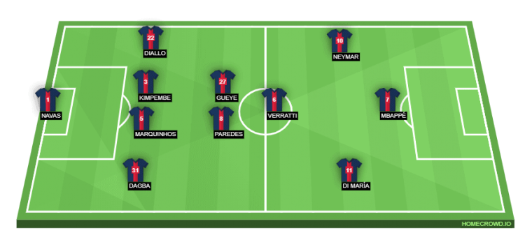 PSG (4-3-3): Navas; Dagba, Marquinhos, Kimpembe, Diallo; Paredes, Gueye, Veratti; Di Maria, Mbappe, Neymar