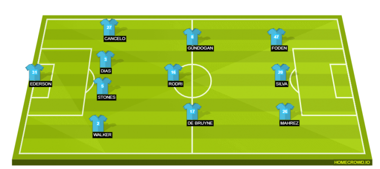 Manchester City (4-3-3): Ederson; Walker, Stones, Dias, Cancelo; Rodri, De Bruyne, Gundogan; Mahrez, Silva, Foden