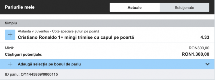 Pe Betfair Sportsbook găsim un pariu interesant, Cristiano Ronaldo trimite minim o minge cu capul pe spațiul porții Atalantei, la o cotă de 4.33.