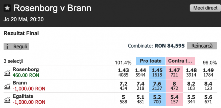 Pe Betfair Sportsbook, pariul special Rosenborg înscrie în ambele reprize și are minim 2 cornere în fiecare repriză are o cotă de 2.63.