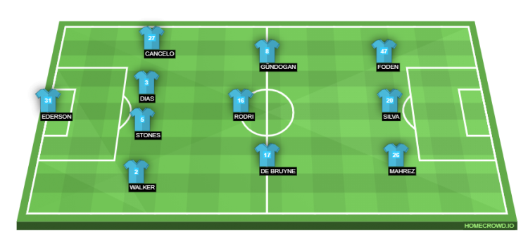 Manchester City (4-3-3): Ederson; Walker, Stones, Dias, Cancelo; De Bruyne, Rodri, Gundogan; Mahrez, Silva, Foden