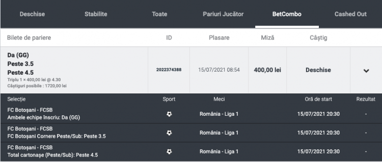 Pe Betano, funcția BetCombo ne permite să combinăm pe același bilet mai multe selecții din cadrul aceluiași meci, iar eu am mizat pe o cotă de 4.30 care conține următoarele: