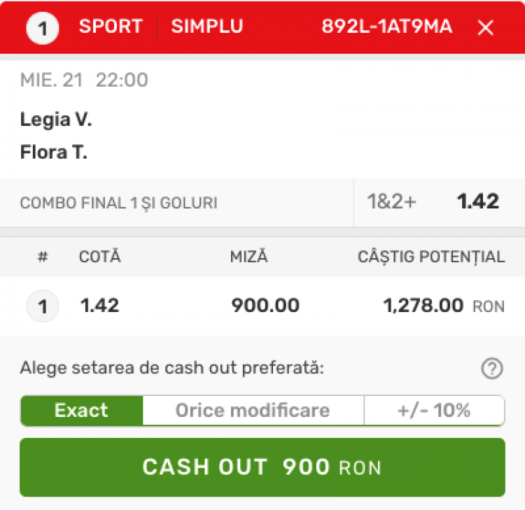 Cu o victorie astăzi, Legia e sigură de prezența în grupele Conference League și ar rămâne în cursa pentru visul cel mare, grupele Ligii Campionilor. Mânată de fanaticii din tribune, campioana Poloniei nu se poate împiedica de Flora. Pe Superbet, Combo-ul 1 final și 2+ goluri în meci are o cotă de @1.42 și îl voi juca în sistem ALL-IN cu tot câștigul de la pariul de ieri.