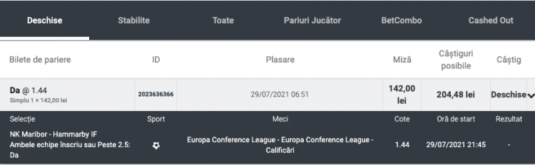 Hammarby este o echipă obișnuită să joace cu garda jos. De cealaltă parte, Maribor este obligată să atace din primul minut pentru a spera la calificare. Pe Betano, cota pentru ambele marchează SAU peste 2.5 goluri în meci este 1.44 și o voi folosi la pasul 2 din challenge ALL-IN început la această casă de pariuri cu tot câștigul de ieri.