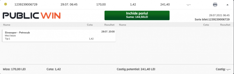 Sivasspor este rodată într-un campionat puternic din Europa. Nu se poate încurca în fața unei formații modeste, fără pedigree european. Pe Publicwin, victoria lui Sivasspor este cotată la @1.42 și o voi folosi pentru pasul 2 de la proiectul ALL-IN la această casă de pariuri, cu tot câștigul de ieri.