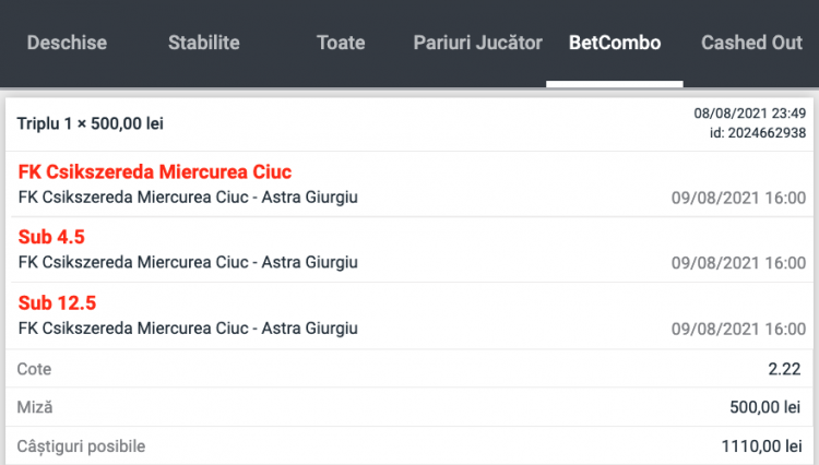 Csikszereda are un lot mult mai experiementat și nu ar trebui să aibă vreo problemă în fața unei echipe de copii. Formația din Miercurea Ciuc nu ne-a obișnuit însă să forțeze, așa că proporțiile scorului ar trebui să rămână în niște limite decente. Pe Betano, pariul combinat Csikszereda câștigă, sub 4,5 goluri marcate și sub 12,5 cornere are o cotă de 2.22.