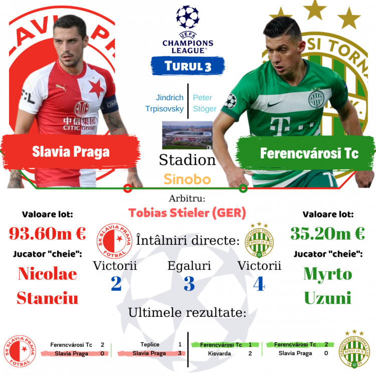 SK Slavia Praga - Ferencvarosi Tc - Cele doua formatii se intalnesc in returul turului 3 preliminar al Ligii Campionilor. In mansa tur jucata in Ungaria, Ferencvarosi s-a impus cu scorul de 2-0, dupa un meci in care cehii au avut initiativa si meci in care eu cred ca meritau sa marcheze. Castigatoarea din aceasta dubla va juca in Play-Off cu castigatoarea meciului dintre CFR Cluj si Young Boys Berna, ceea ce inseamna un adversar cam de acelasi calibru sau chiar mai slab. Slavia Praga joaca exceptional pe teren propriu si stim foarte bine numeroasele rezultate excelente inregistrate de-a lungul ultimilor ani. Ungurii au inceput in forta sezonul si practica un fotbal bun, un fotbal ofensiv, iar asta nu le-a adus decat rezultate pozitive.