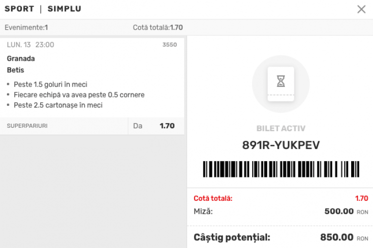 Pe Superbet, în secțiunea SUPERPARIURI a acestui meci, găsim următoarea combinație: peste 1,5 goluri în meci & fiecare echipă va avea peste 0,5 cornere & peste 2,5 cartonașe galbene în meci la o cotă de 1.70 iar eu o voi juca la o miză normală ca și TREAPTA 1 a unei noi serii din proiectul PIRAMIDA!