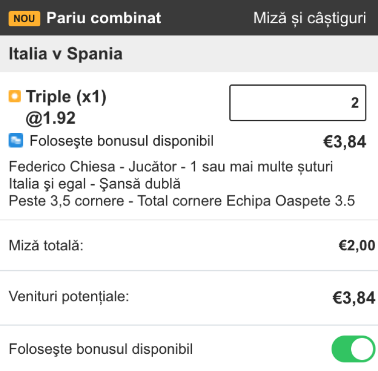 Pentru a obține bonusul, trebuie să mergeți în pagina promoției AICI și să revendicați bonusul. Apoi nu faceți decât să deschideți cotele meciului (link direct AICI) și apoi selectați tabul de Pariu Combinat. După ce adăugați minim 2 selecții pe biletul de pariuri, adăugați 10 Ron miza în partea de sus a biletului și apoi selectați din partea de jos Folosește bonusul disponibil
