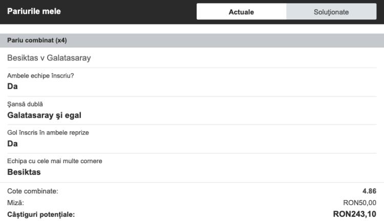 Am jucat un pariu combinat la cotă 4.86 pe Betfair Sportsbook astfel: