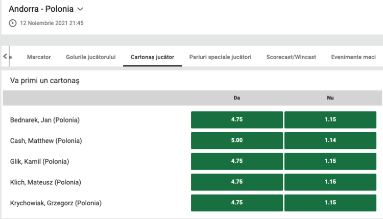 După cum puteți observa în imaginea de mai sus, Glik și Krychowiak sunt deja listați la cotă 4.75 să primească un cartonaș, iar cotele sunt disponibile prematch în UNIBET, una dintre cele mai mari agenții online licențiate în România. Dacă doriți să vă deschideți un cont nou la UNIBET, folosiți acest link pentru a primi un BONUS de 300 de Ron din partea casei la prima depunere