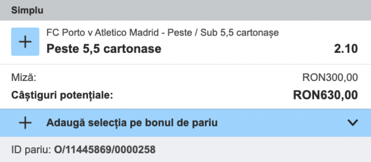 Pe Betfair Sportsbook, cota pentru peste 5.5 cartonașe în Porto - Atletico Madrid este @2.10.