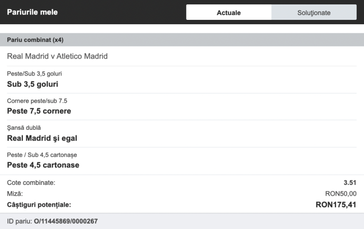 Cota pentru pariul combinat sub 3.5 goluri în meci, peste 7.5 cornere, șansă dublă 1X și peste 4.5 cartonașe galbene este @3.51, dar vă invit să verificați și pariul în handicap asiatic din clipul de mai sus 👆👆👆