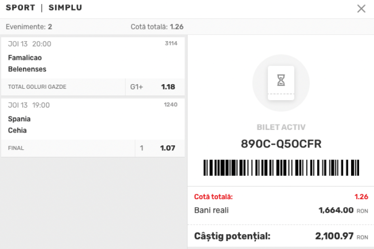 După 3 pariuri am ajuns de la 500 la 1664 de Ron și îl mizez pe tot în continuare! Azi am combinat 2 meciuri pe același cupon pentru o amărâtă de cotă 1.26, dar nu-i nicio problemă, pentru că ne-a ajutat ieri pariul de cotă 1.75 să ne ridicăm mai repejor!