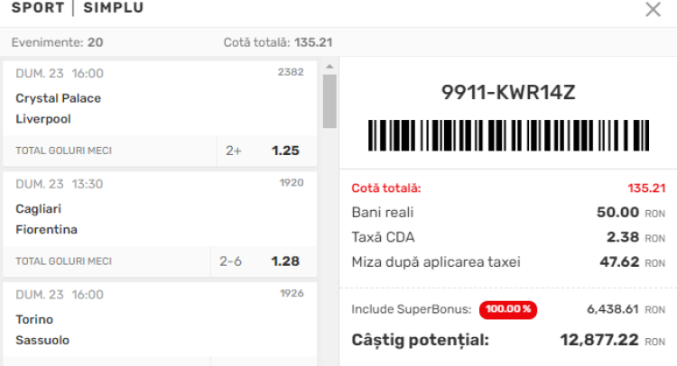 Astazi avem foarte multe meciuri in campionatele puternice si nu numai si am ales sa creez un bilet BONUS DUBLU la Superbet. Am ales sa mizez pe dueluri in care echipele au medii mari de goluri, dar si pe echipe clar favorite si intr-o forma foarte buna. Mai jos aveti cele 20 de meciuri pe care eu le-am selectat, alaturi de un printscreen cu biletul si codul pe care il puteti utiliza daca doriti sa-l pariati la o agentie de pariuri stadala.
