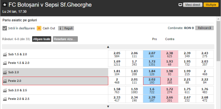 Va fi un meci extrem de dificil pentru Botosani pentru ca cei de la Sepsi trag tare sa prinda Play-Off-ul, iar un esec nu ar pica deloc bine pentru oaspeti. Deasemenea, cu un portar de 22 de ani in poarta si fara experienta, Botosani risca enorm, deasemenea, lipsa lui Croitoru e si ea foarte importanta. De la Sepsi a plecat Cornel Sfaiter, omul care a facut performanta cu Sepsi. Acesta a plecat la Iasi pentru a incerca acelasi lucru, unde in acest moment ocupa functia de presedinte al clubului. Sepsi, in acest sezon, a reusit sa marcheze mai mult de un gol in deplasare doar contra celor de la Clinceni si contra celor de la Mioveni ceea ce e destul de dezamagitor, insa partea buna e ca s-au aparat bine si au pierdut doar in fata CFR-ului si a celor de la Farul. E destul de dificil de ales o castigatoare pentru ca ambele echipe isi doresc victoria, egalul neajutand niciuna dintre ele. Avand in vedere acest lucru, am ales sa mizez pe goluri. Pontul meu pentru partida FC Botosani - Sepsi OSK este ”Peste 2.0 goluri asiatice” la o cota de 2.00, disponibila pe Betfair Exchange.