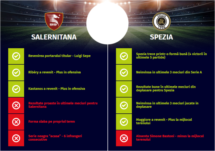 Spezia e pe locul 15 dupa 23 de jocuri disputate cu 25 de puncte acumulate. Chiar daca nici defensiva si nici ofensiva nu sunt extraordinare, Spezia traverseaza o forma foarte buna si porneste favorita in duelul din aceasta seara. Spezia vine dupa 3 succese in Serie A: 1-0 vs Genoa, 2-1 vs AC Milan si 1-0 vs Sampdoria. In ultime 4 partide directe, Spezia s-a impus cu aleasi scor, 2-1.