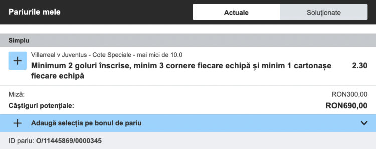 Pe Betfair Sportsbook, pariul special minimum 2 goluri înscrise, minim 3 cornere fiecare echipă și minim 1 cartonașe fiecare echipă are o cotă de @2.30.
